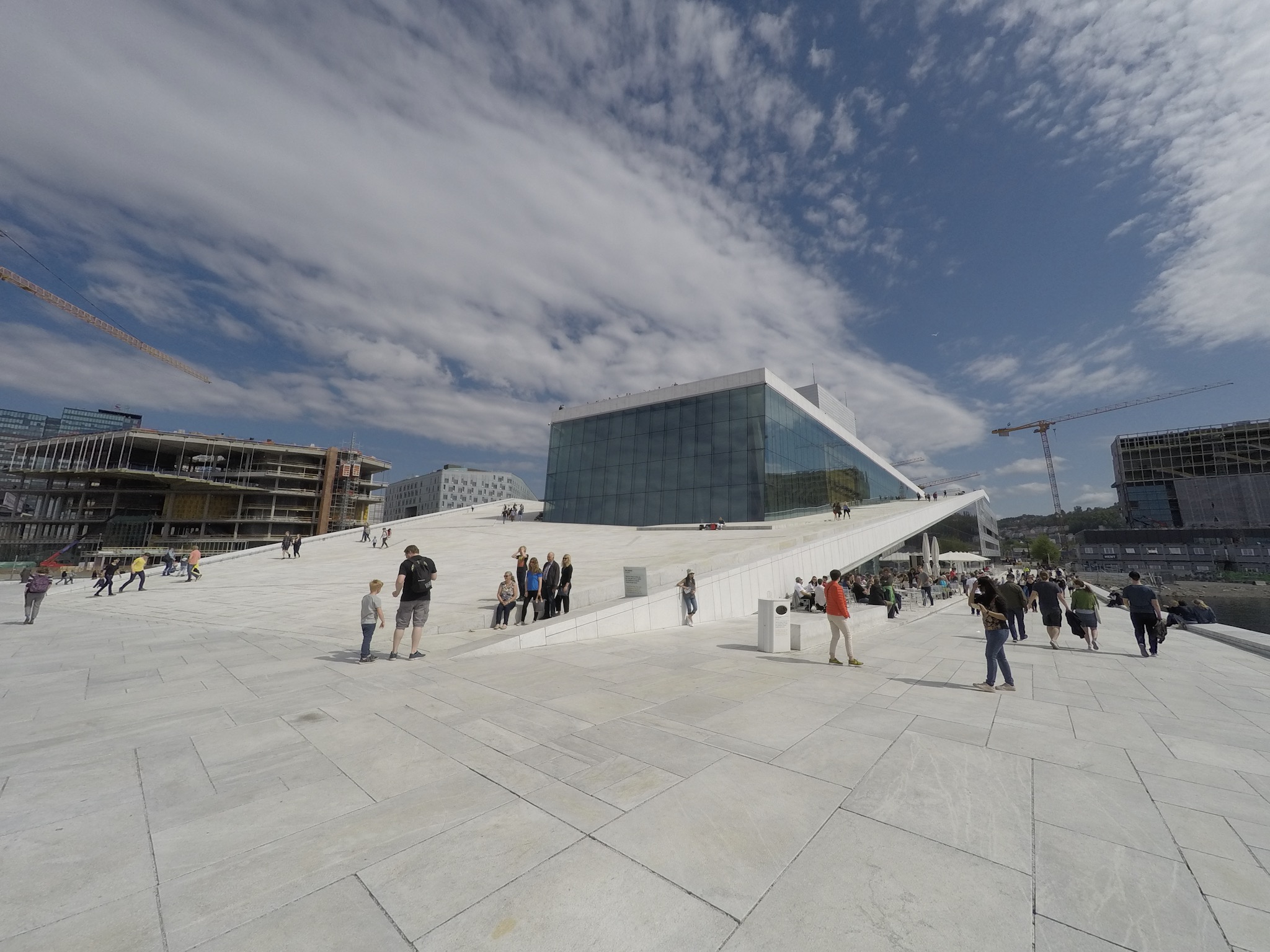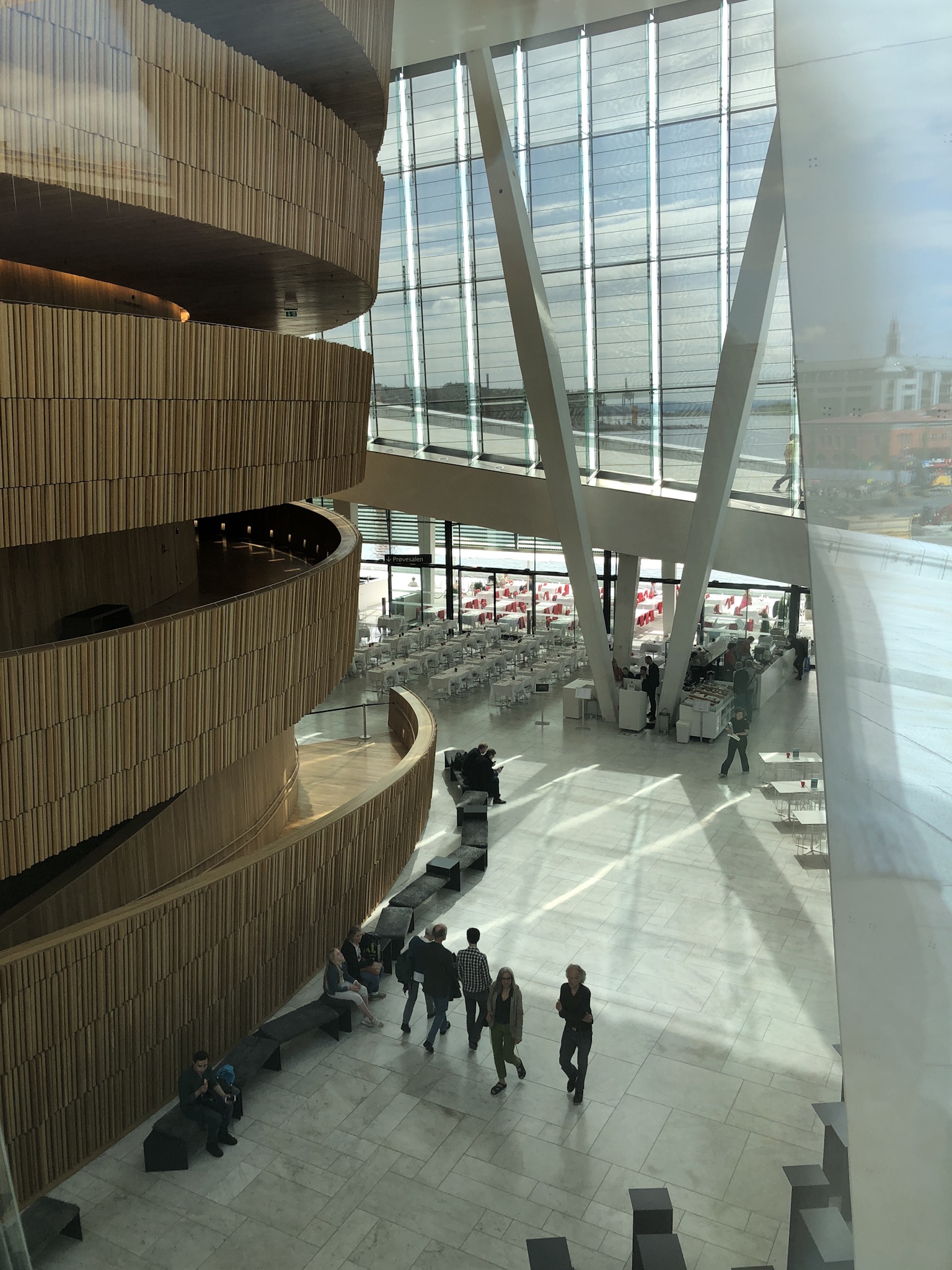 The Opera House in Oslo is an impressive modern building on the harbour. Designed by the Norwegian architects Snøhetta, it looks like it is arising from the waters of the Oslo Fjord. The roof is designed to be walked on and used as a public space, and the dramatic foyer with its undulating oak panelled wall and lots of glass is quite awe-inspiring. We took a guided tour and got to see inside – backstage, rehearsal rooms, costume workshops – and even got to sit in on part of a dress rehearsal of Don Giovanni.