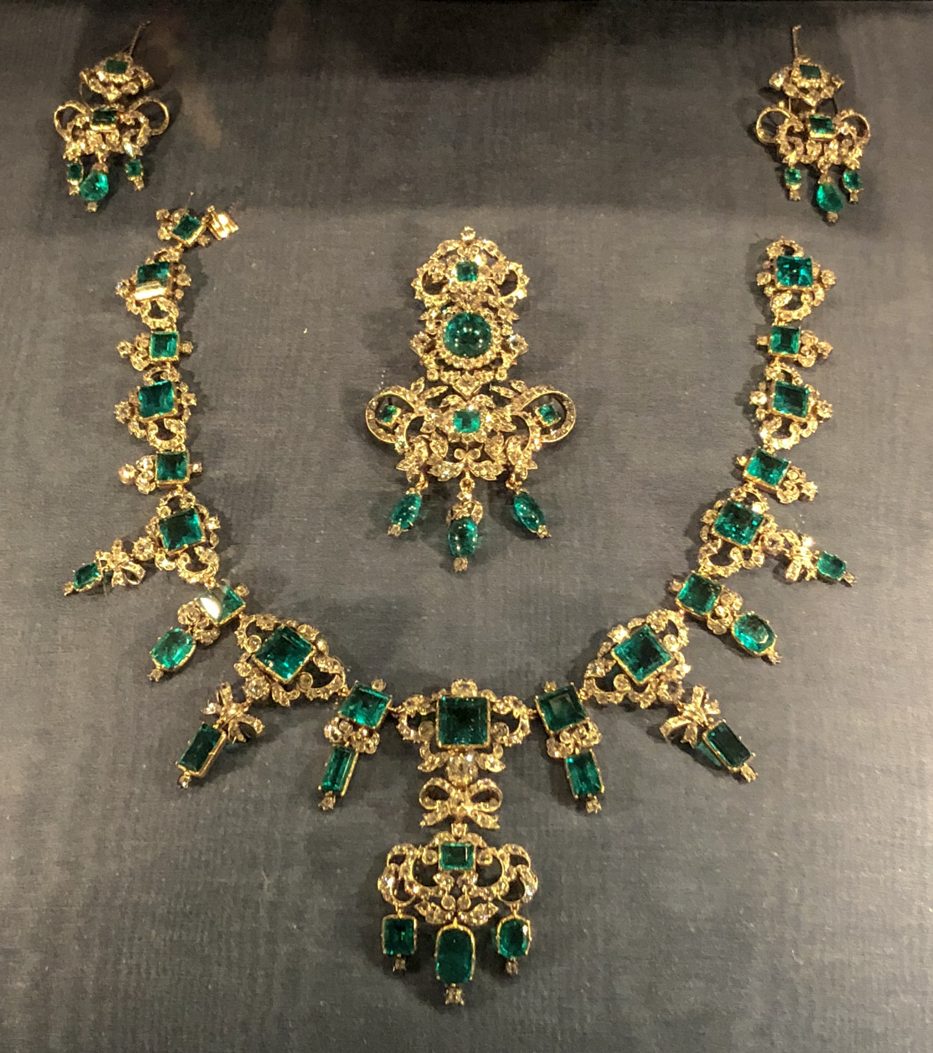 Set of emeralds and brilliants with diadem, necklace, brooch and earrings. Made in 1840. The emeralds themselves were originally a present from Christian VI to Sophie Magdalene in 1723.
