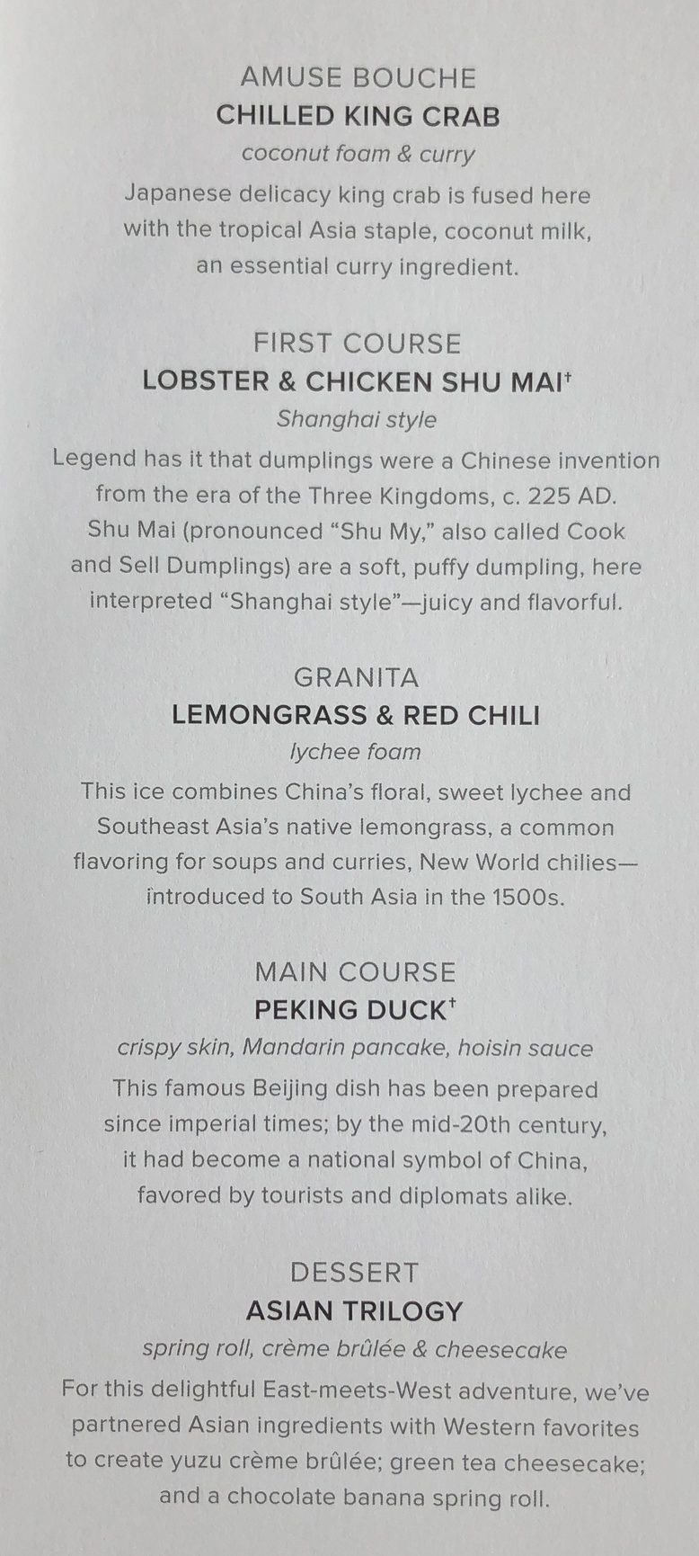 Glad you enjoyed the food and venues as much as we did. Reading the menus for your two Asian meals at the Chef’s table makes me long to sail them again..those are new since we were aboard and sound tastier than the Chinese one we were offered.