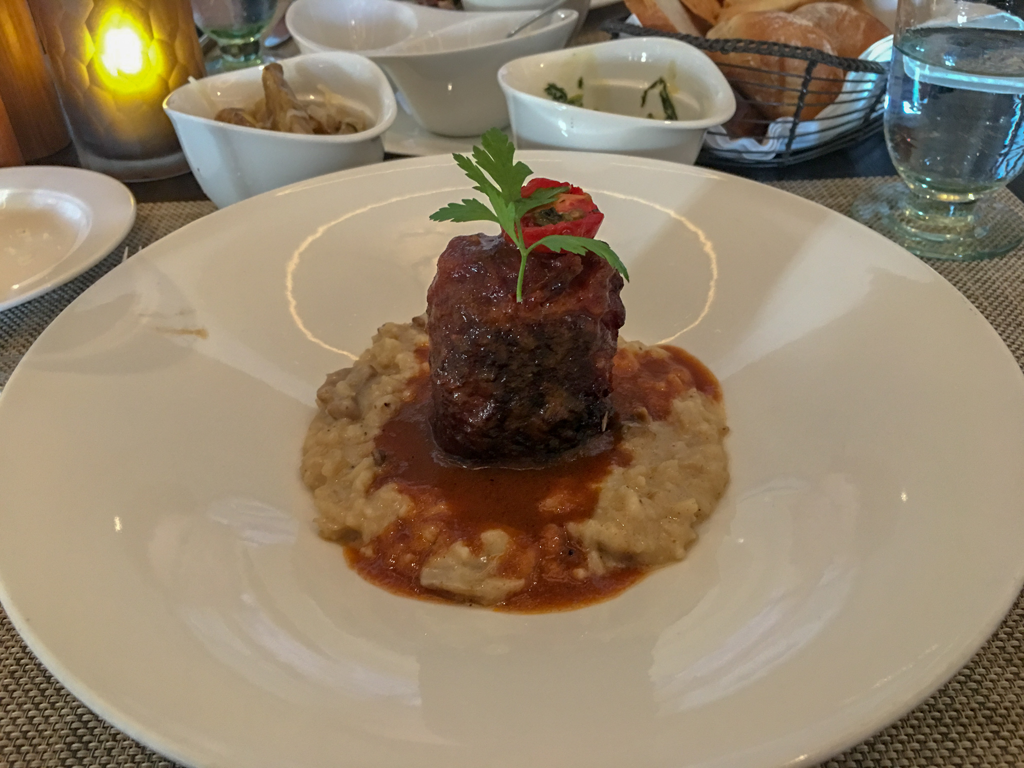 Gambo di Vitello Avvolto in Prosciutto: Braised & deboned veal osso buco wrapped in prosciutto, served with a porcini mushroom risotto