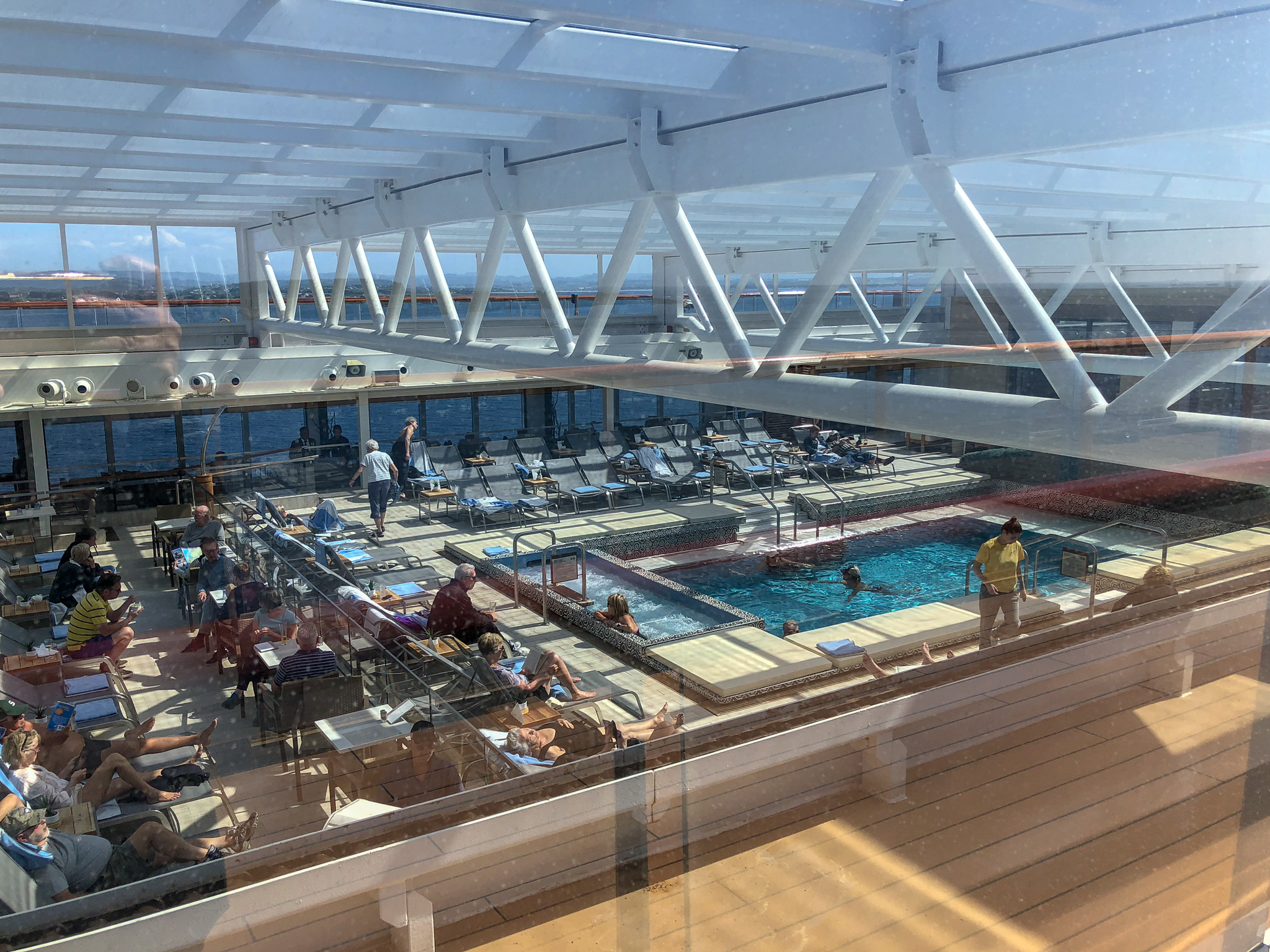 Not a good photo as it is taken through glass but you can see the tables and lounge chairs of the Pool Grill on the left.