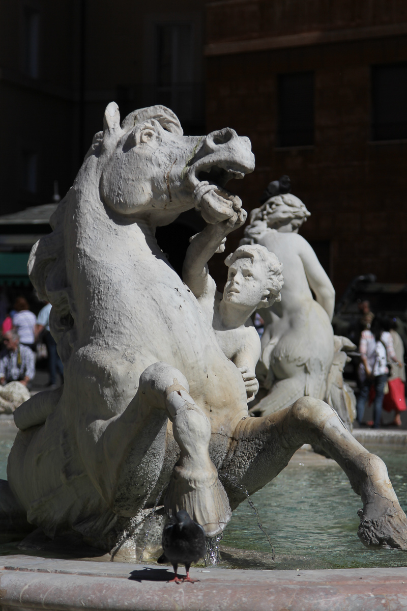 The Fountain of the Moor is at the southern end of the Piazza. It was designed by Italian architect and sculptor Giacomo Della Porta in 1575. Giacomo was a follower of Michelangelo and actually worked with him on St Peter’s Basilica in Vatican City. He also designed the facade of the Gesu Church, which we can see from our hotel window. Originally it featured only a dolphin in the centre, surrounded by four Tritons. Bernini added the figure of the Moor (or African), straddling the dolphin, in 1653.