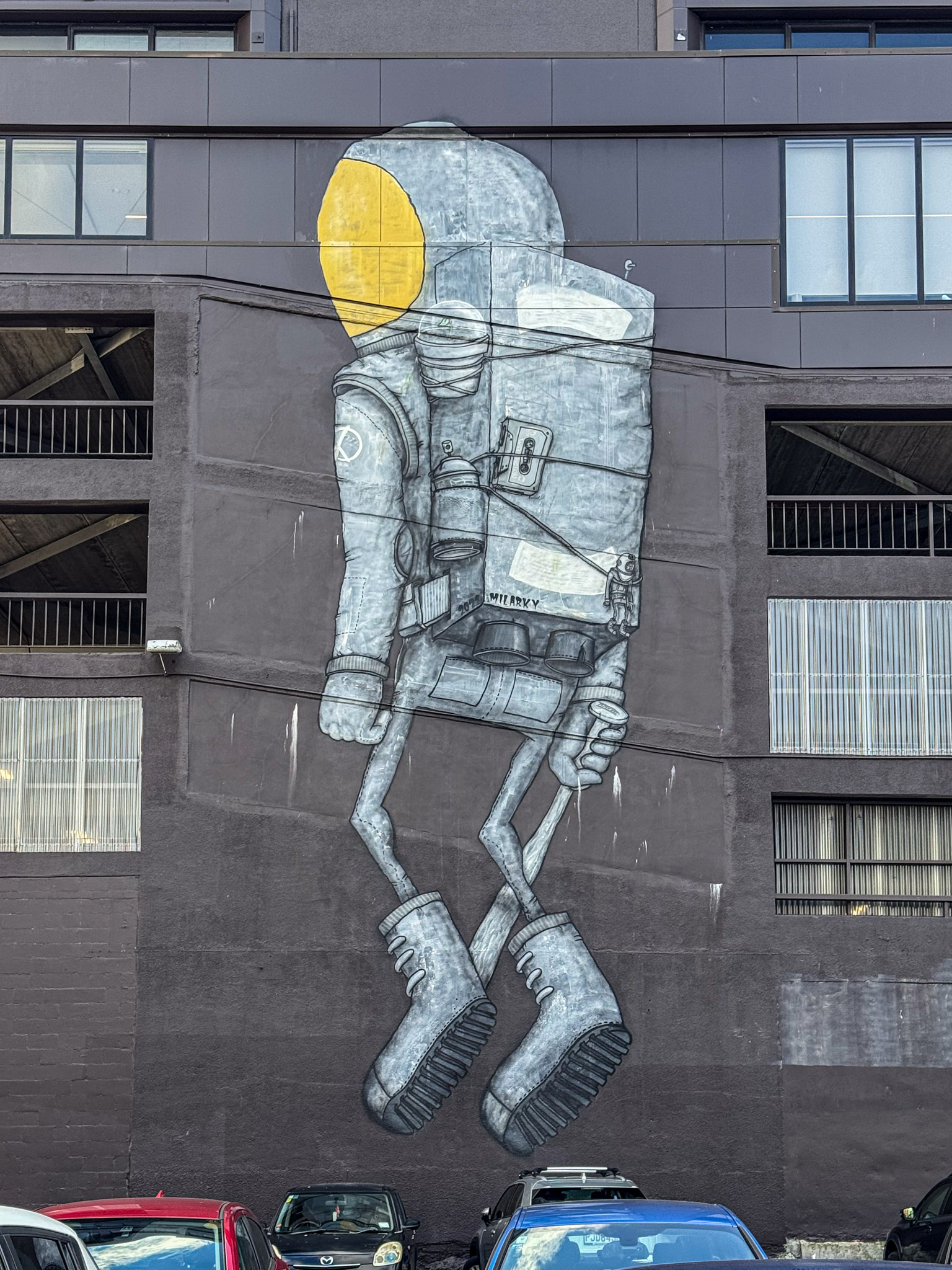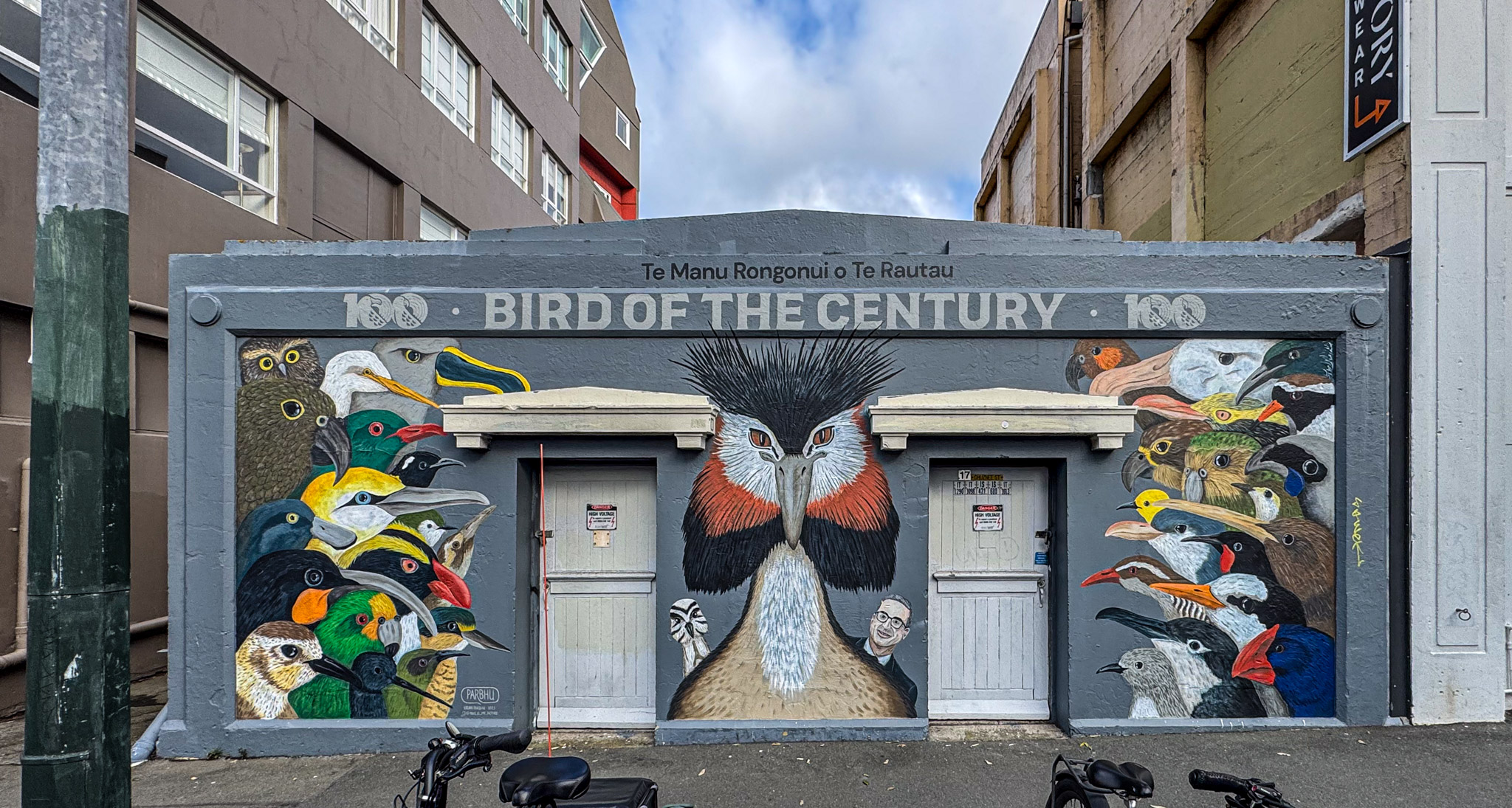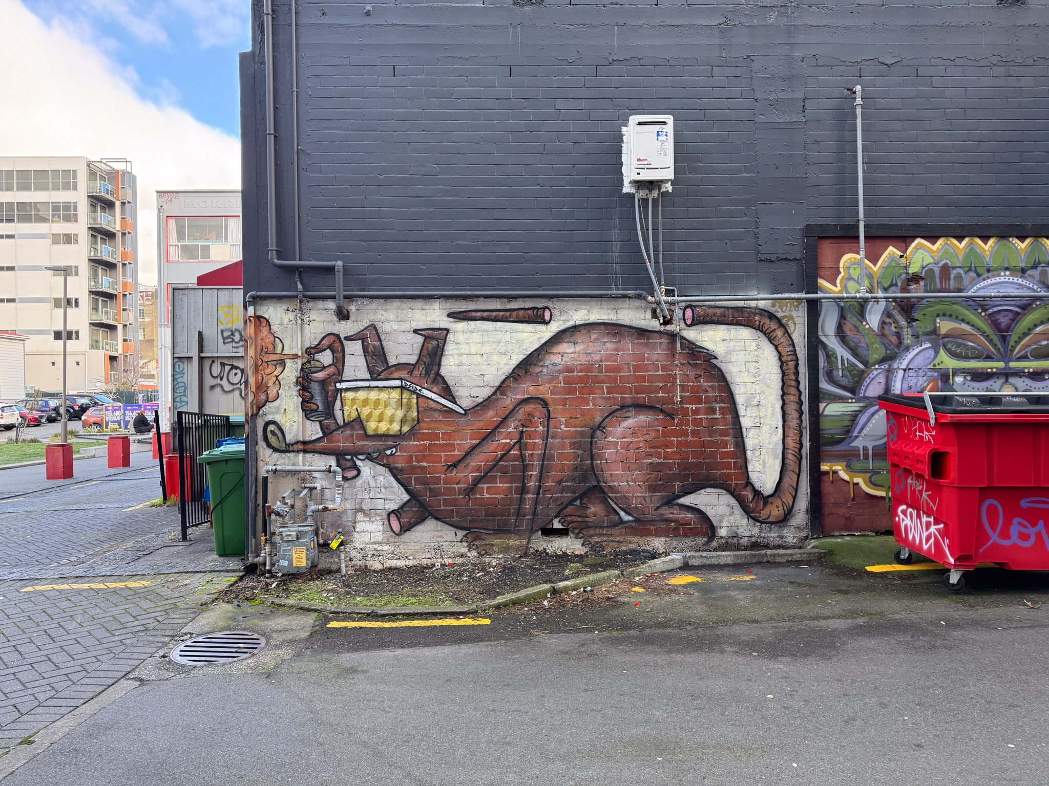 I think street art is a lot like Pokémon for art nerds – it gets people who would otherwise be happy curled up with a book or enjoying a nice warm indoor art gallery outside and pounding the streets! Which is what we did this afternoon. We were in a somewhat less salubrious part of Wellington, and a fair number of murals were damaged or covered in graffiti, but then we found some that we weren’t looking for – here’s a selection of the best. Eventually we were too cold and tired and headed back to the hotel to relax – and stayed for the rest of the day.