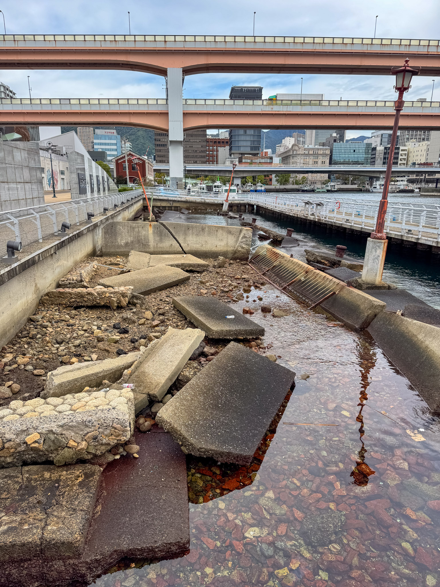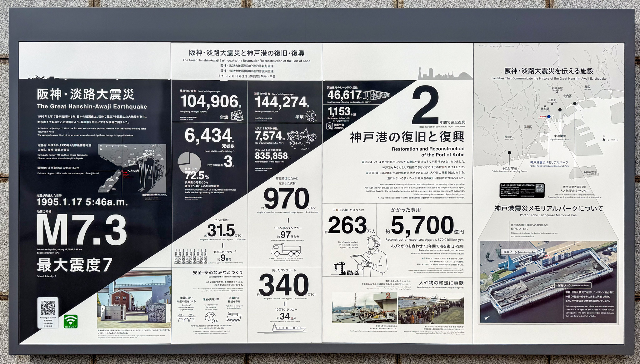Meriken Park is the location of a memorial to the massive earthquake of 1995 which devastated Kobe. A series of wall panels and some videos tell the story of the earthquake and the subsequent recovery, and a small part of the original port has been left to illustrate the level of damage. A plaque reads: “Port of Kobe Earthquake Memorial Park was constructed as a reminder of the Great Hanshin-Awaji Earthquake that devastated the southern part of Hyogo Prefecture. It hit the area at 5:46 a.m. on January 17, 1995, causing as many as 40,071 casualties, destroying 247,486 homes and buildings. The victims of the most powerful earthquake ever recorded in the area amounted to 444,900 households. The memorial park is meant to be evidence of the calamitous earthquake, preserving part of Meriken Park as it was immediately after the severe quake. Together with its exhibits, the park illustrates the restoration process of the Port of Kobe. It serves as a painful lesson as well as a vivid reminder of the important role the port played in the aftermath. It is also a tribute to the patience and dedication of all the people from all over the country and overseas who worked to restore and reconstruct the port. “