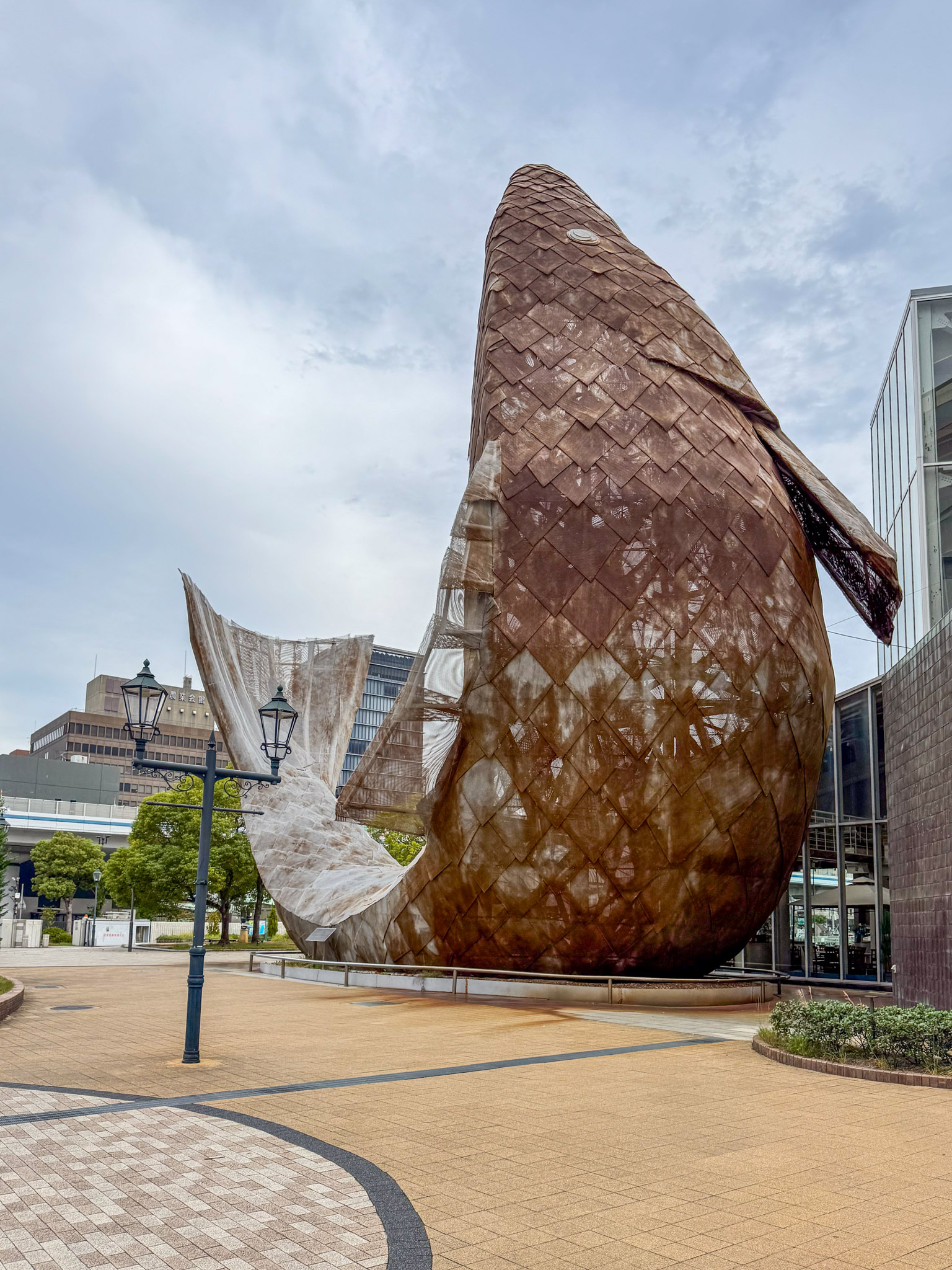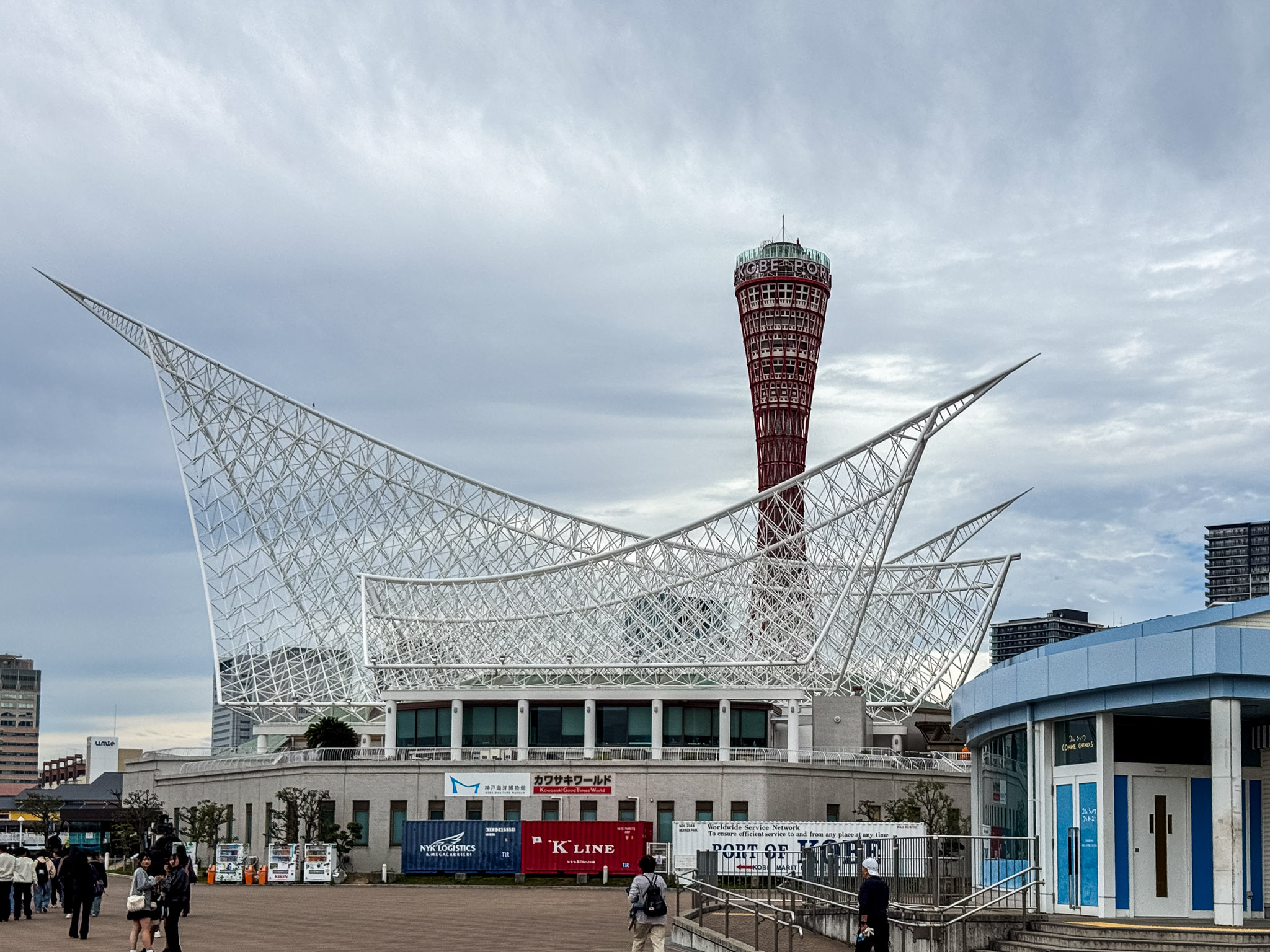 Our ship was docked close to Meriken Park, so that was our first destination. A grassy waterfront park, it contains a number of art installations and street art, as well as some significant exhibition spaces including the Kobe Maritime Museum and Kawasaki Good Times World (which we did not have time to visit). The large fish (“Fish Dance” by Frank Gehry) was a standout. The name of the park comes from the word “American,” which was commonly translated as “Meriken” during the Meiji era, as the US consulate was located here. While we were there an emergency message (in Japanese) was broadcast to all our phones, while a siren sounded. Fortunately, Google Translate was able to tell us it was just a drill, but it was a bit scary all the same!